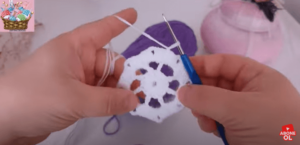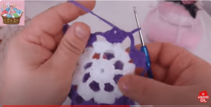 1-with purple thread, ch 4. Make 10 double crochet stitches in the fourth chain from the crochet.