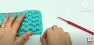 - Row 3: Ch 1, turn, popcorn stitch in the next stitch, skip 3 stitches. Repeat * to * across the row.