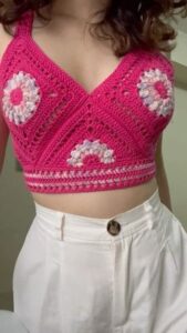 Creating a crochet motif bustier blouse involves making individual motifs and then joining them together to form the bodice of the blouse. Here’s a basic guide on how to make a crochet motif bustier blouse: