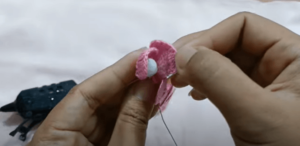 Roll the piece into a rosebud shape and secure with a few stitches. You can use the yarn needle to sew the bottom closed.