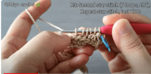 - Work a star stitch in the first sc, ch 1, skip 1 sc, star st in next sc. Repeat * to * across, ending with a hdc in the last sc. Turn.