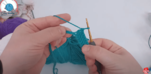 - Cut your yarn, leaving a long tail. Thread the tail through the last loop on your hook and pull tight to secure.