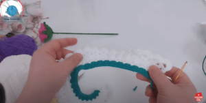 Roll the crocheted piece tightly to form the center of the rose. Use the long tail to sew the bottom of the rose closed. Weave in any remaining ends with your yarn needle.