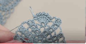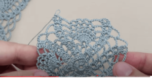 - Ch 5, sc in the next ch-1 sp, ch 5, 1 dc in each of the next 5 dc – Repeat from * to * 5 more times.